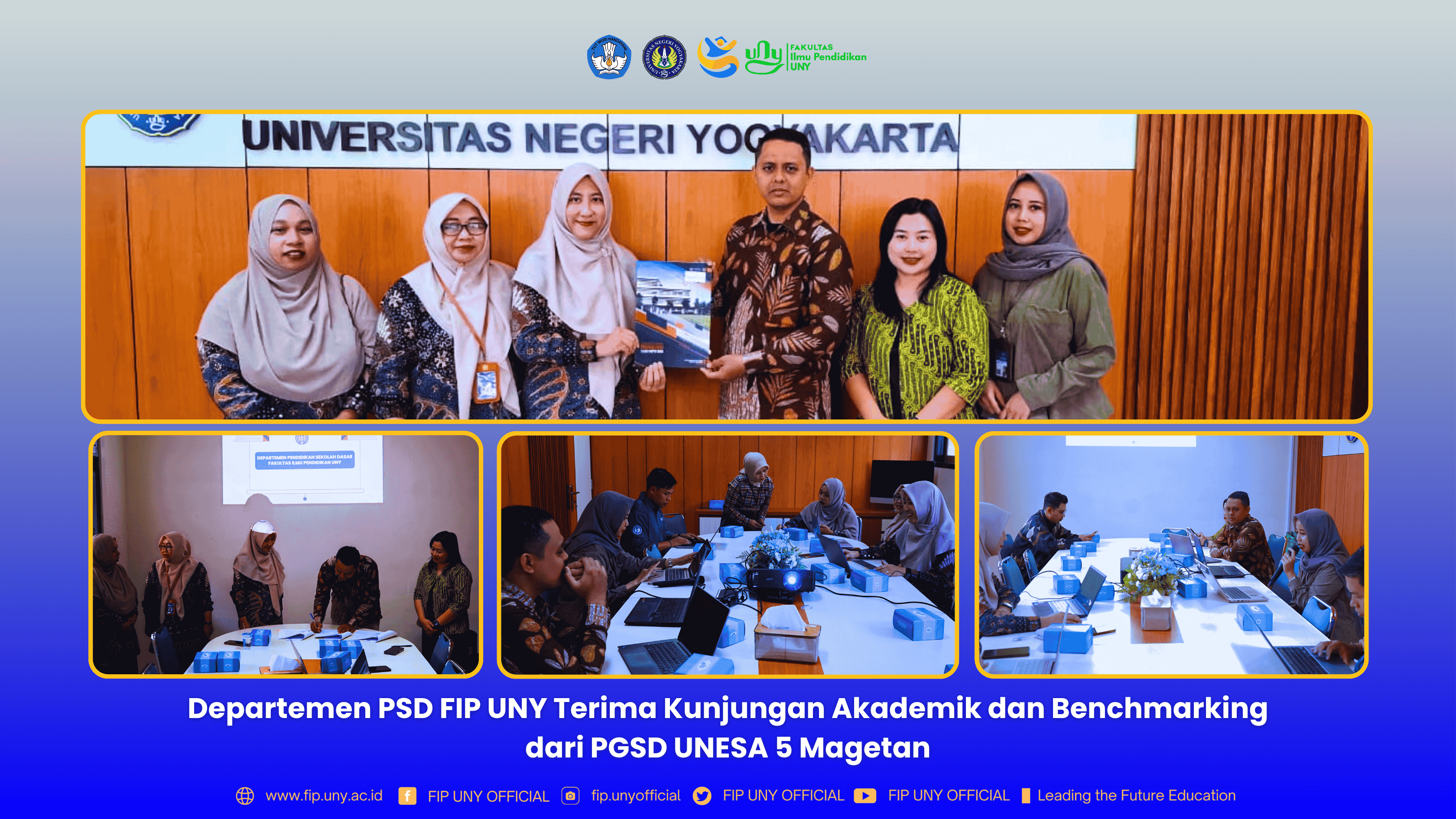 Yogyakarta, 15 Oktober 2025 — Departemen Pendidikan Sekolah Dasar (PSD) Fakultas Ilmu Pendidikan (FIP) Universitas Negeri Yogyakarta (UNY) menerima kunjungan akademik dan benchmarking dari Program Studi S1 Pendidikan Guru Sekolah Dasar (PGSD) Kampus UNESA 5 Magetan. Kegiatan ini berlangsung pada Rabu (15/10) pukul 09.00 WIB hingga selesai di Ruang Rapat Departemen PSD FIP UNY.