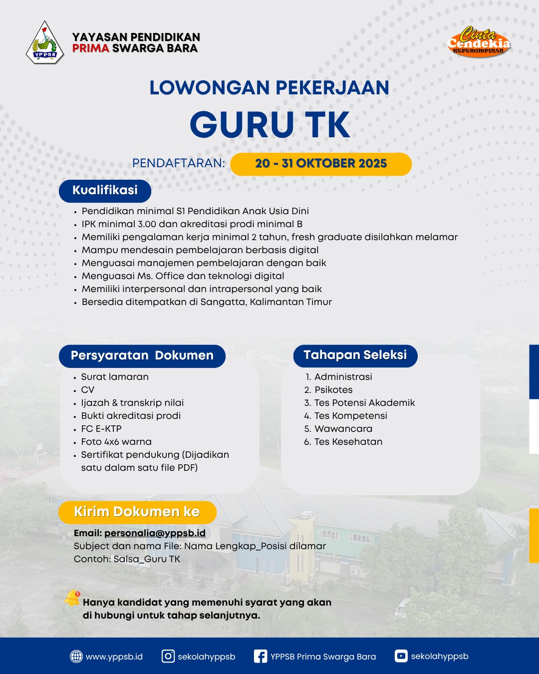 Lowongan Guru TK Yayasan Pendidikan Prima Swarga Bara 2025