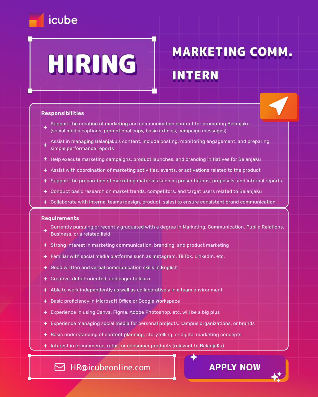 Bergabunglah dengan tim kreatif dan inovatif kami di ICUBE! Kami mencari talenta terbaik yang siap berkontribusi dan tumbuh bersama.