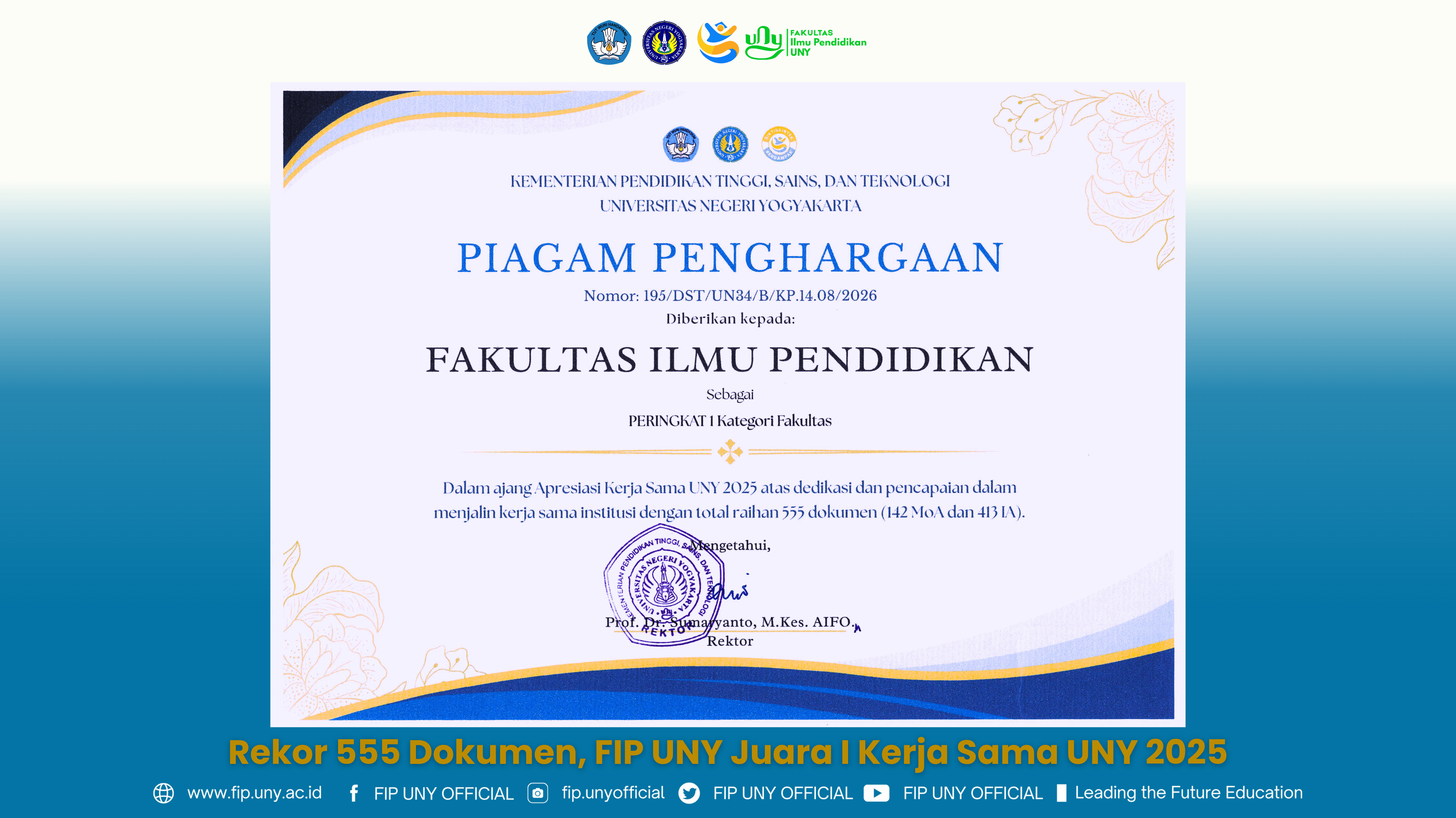Yogyakarta,12-01-2026 – Fakultas Ilmu Pendidikan (FIP) Universitas Negeri Yogyakarta (UNY) meraih Juara I dalam Ajang Apresiasi Kerja Sama UNY Tahun 2025 atas capaian kinerja kemitraan institusional yang unggul. Sepanjang tahun 2025, FIP UNY berhasil membukukan total 555 dokumen kerja sama, terdiri atas 142 Memorandum of Agreement (MoA) dan 413 Implementation Arrangement (IA).