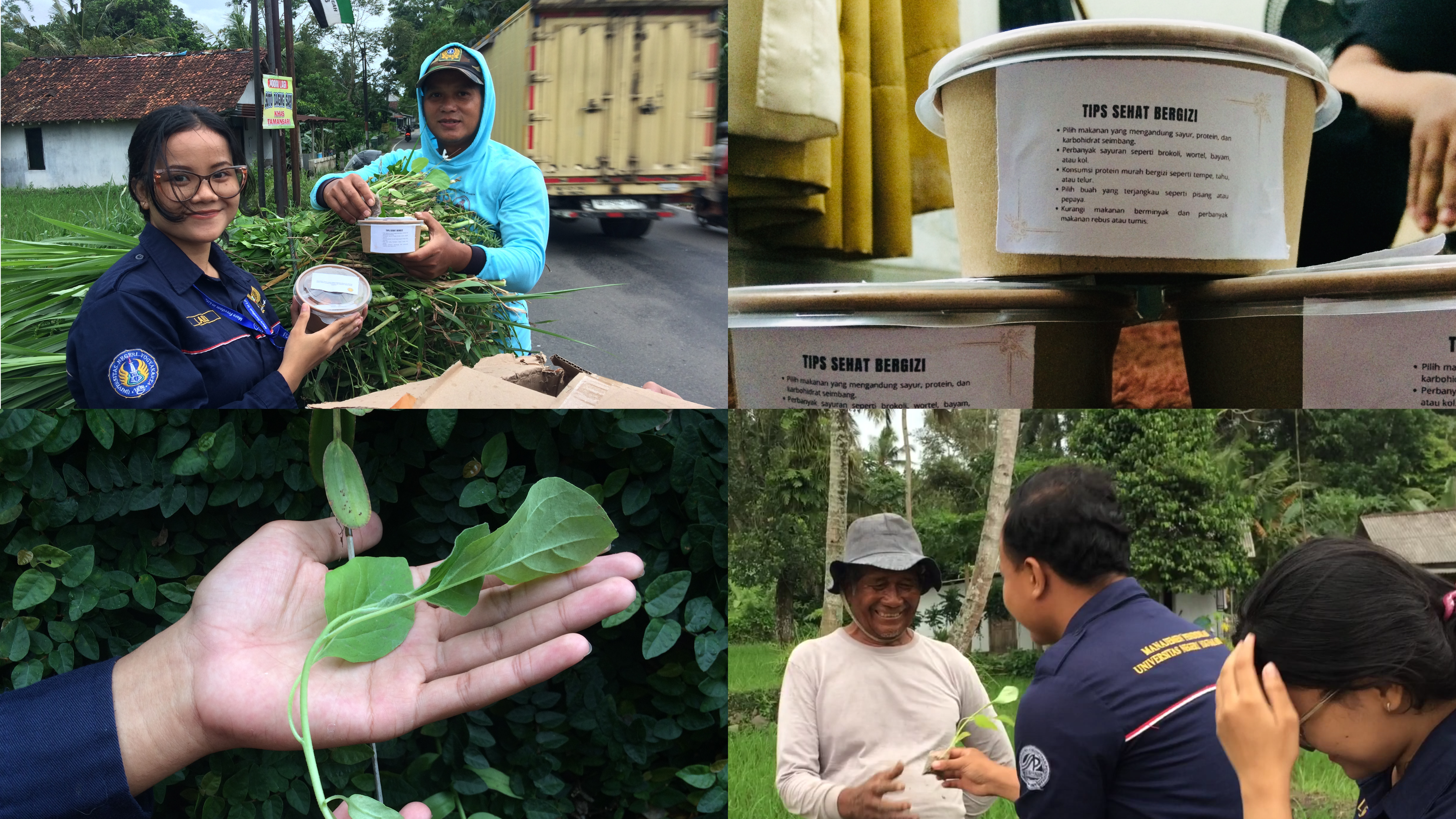 Dalam pelaksanaannya, mahasiswa menyiapkan paket makanan bergizi berupa capcay brokoli, tempe, dan ayam goreng. Menu ini dipilih dengan pertimbangan gizi seimbang: sayuran kaya vitamin, protein nabati, dan protein hewani. Selain memberikan makanan sehat, mahasiswa juga membagikan kartu informasi berisi tips memilih makanan bergizi serta panduan merawat tanaman tomat. Kartu ini dibuat dengan bahasa sederhana dan visual yang mudah dipahami agar pembaca dapat langsung mempraktikkannya di rumah.