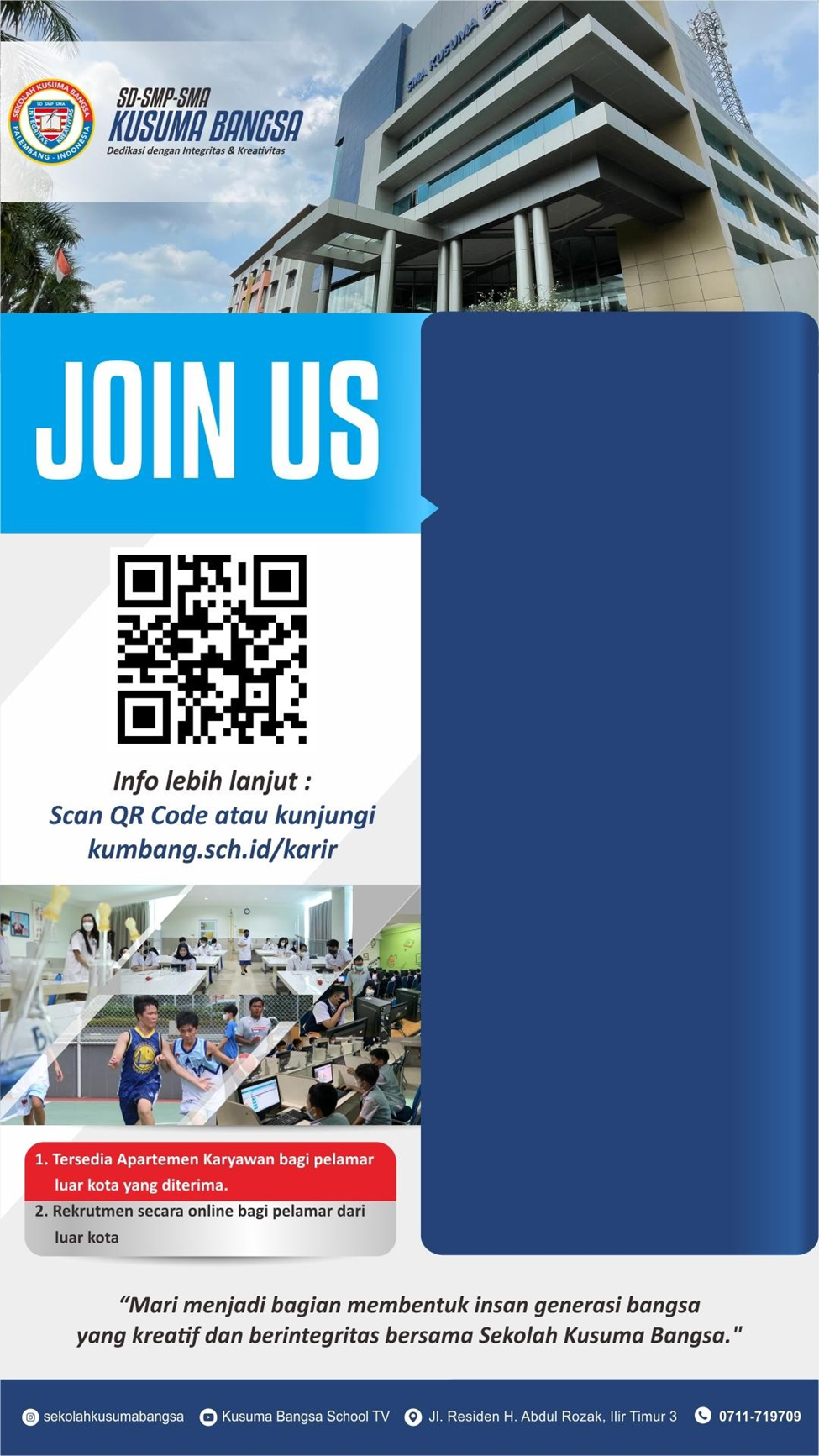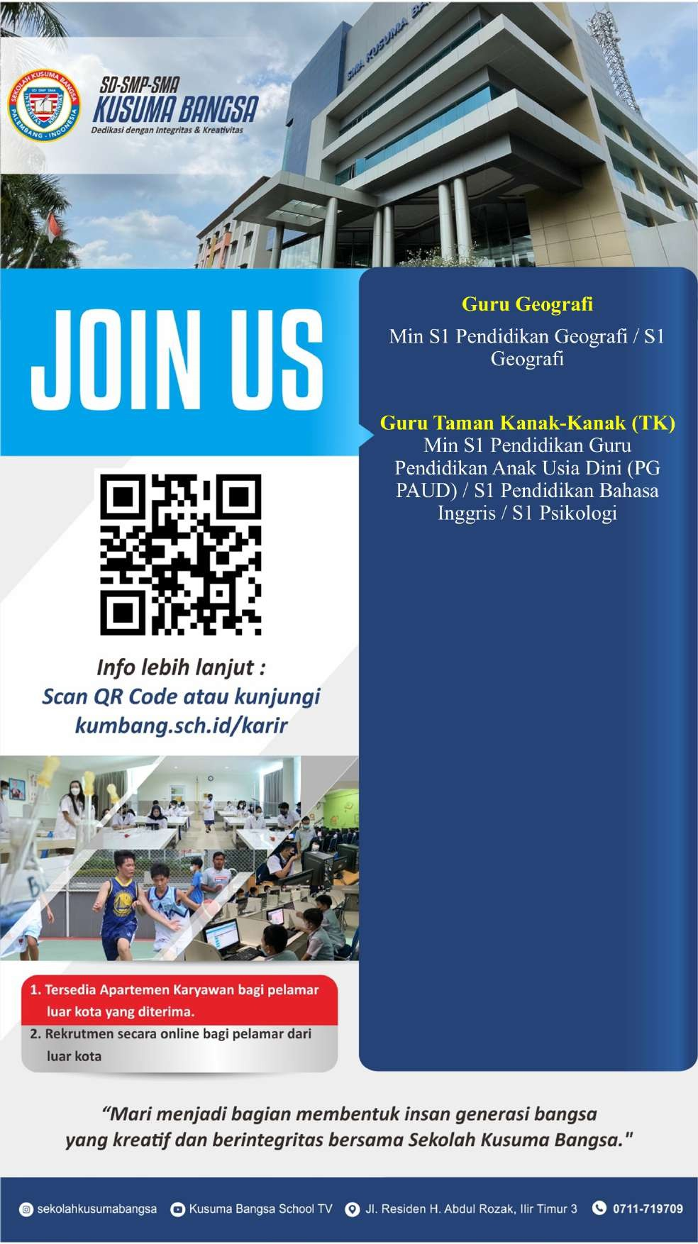 Saat ini, Sekolah Kusuma Bangsa, lembaga pendidikan modern di Sumatera Selatan yang berdedikasi sejak tahun 2000, membuka kesempatan bergabung bagi tenaga pendidik dan profesional muda.